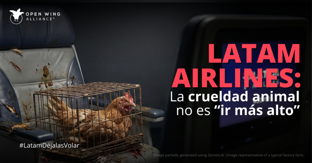 LATAM Airlines se jacta de su sostenibilidad, pero sigue permitiendo que sus proveedores confinen a miles de gallinas en jaulas de batería para sus menús a bordo.